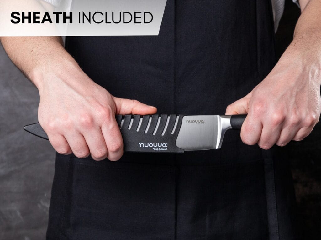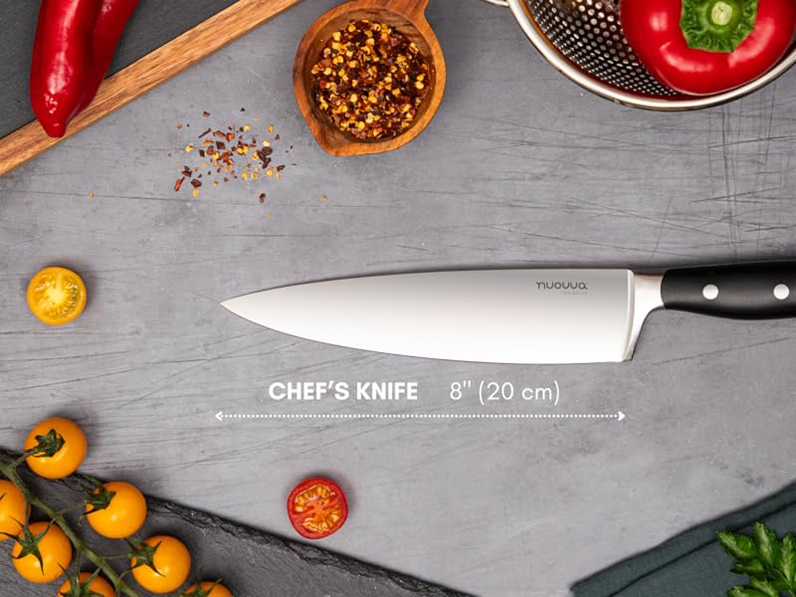 Cook with precision using this 8-inch high-carbon stainless steel chef knife. Features sharp, durable blade, ergonomic handle for comfort, and includes a protective sheath. Ideal for slicing, dicing, and chopping.