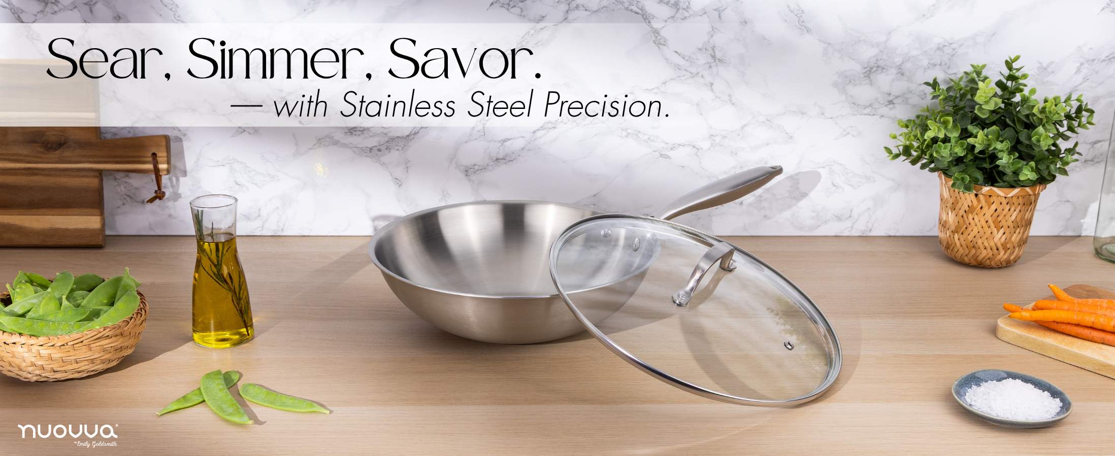 Cook with the Nuovva 28cm stainless steel wok. Tri-ply construction ensures even heat, with a cool-touch handle and glass lid. Non-stick, induction compatible, durable, stylish, and easy to clean.
