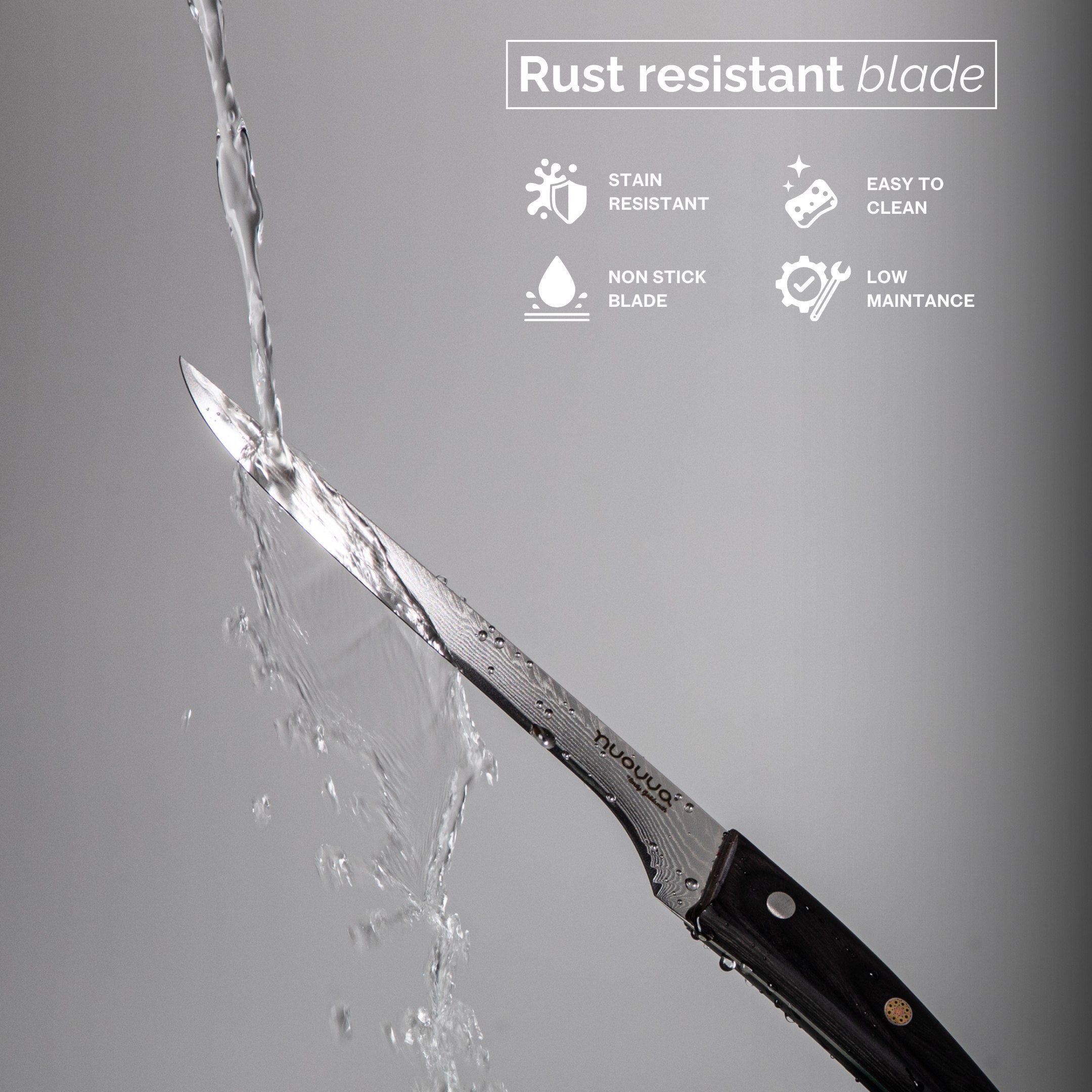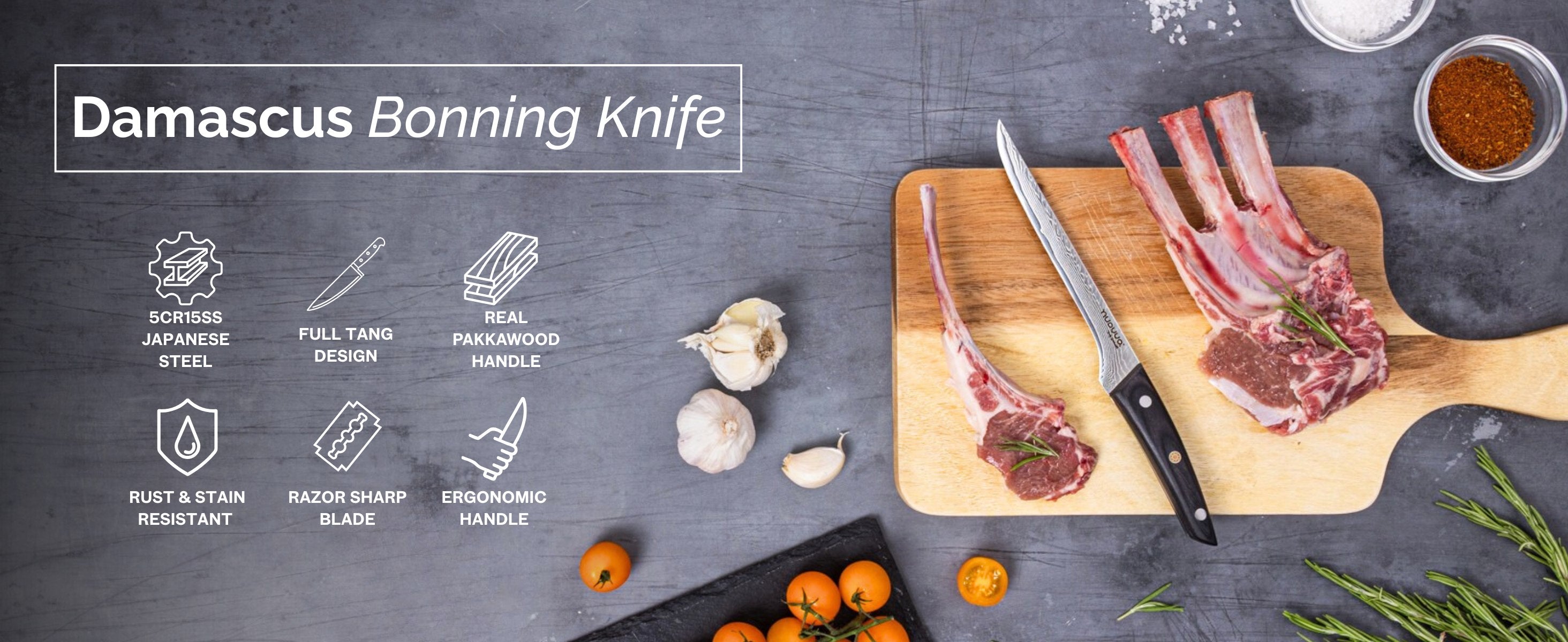 Cook like a pro with this 6-inch boning knife crafted from 67-layer Japanese Damascus steel. It offers sharpness, flexibility, and precise cuts, featuring an ergonomic rosewood handle and durable full-tang design.