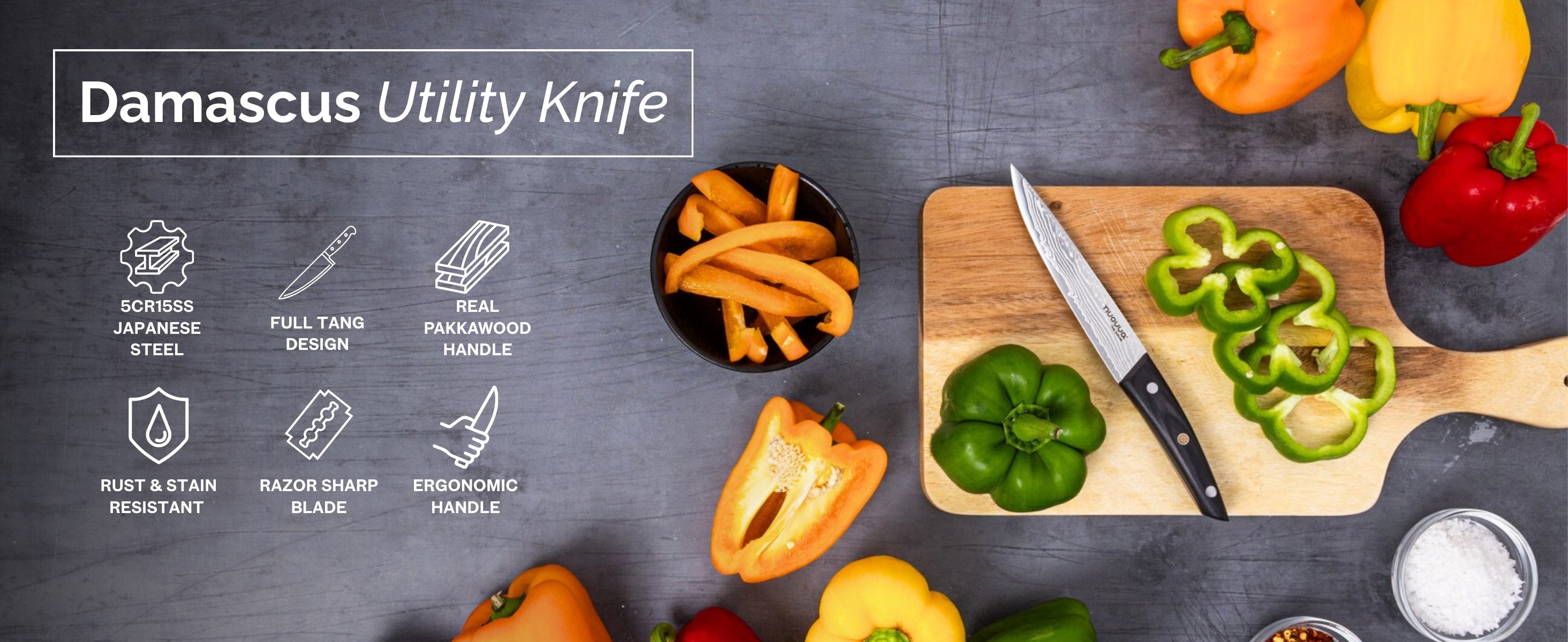 Upgrade your kitchen with the 5" Utility Knife by Nuovva. Made from 67-layer Damascus steel with a sharp blade and elegant rosewood handle for precision and lasting durability.