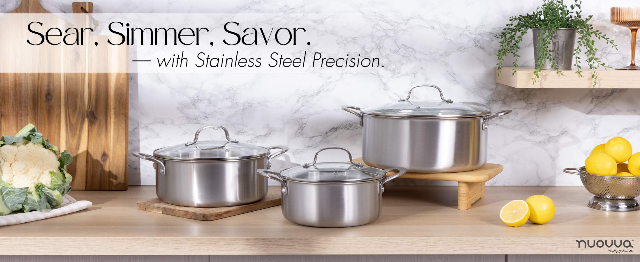 Upgrade your kitchen with the Nuovva 6-piece casserole set. Tri-ply stainless steel, glass lids, cool-touch handles, and induction compatible. Durable, stain-resistant, and dishwasher safe for easy care.