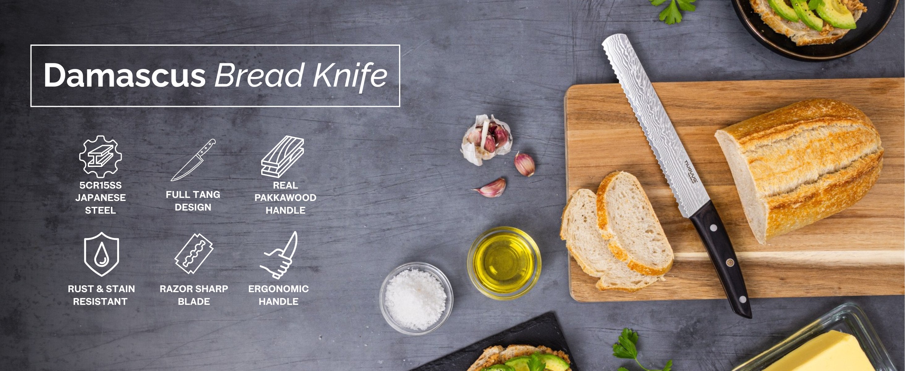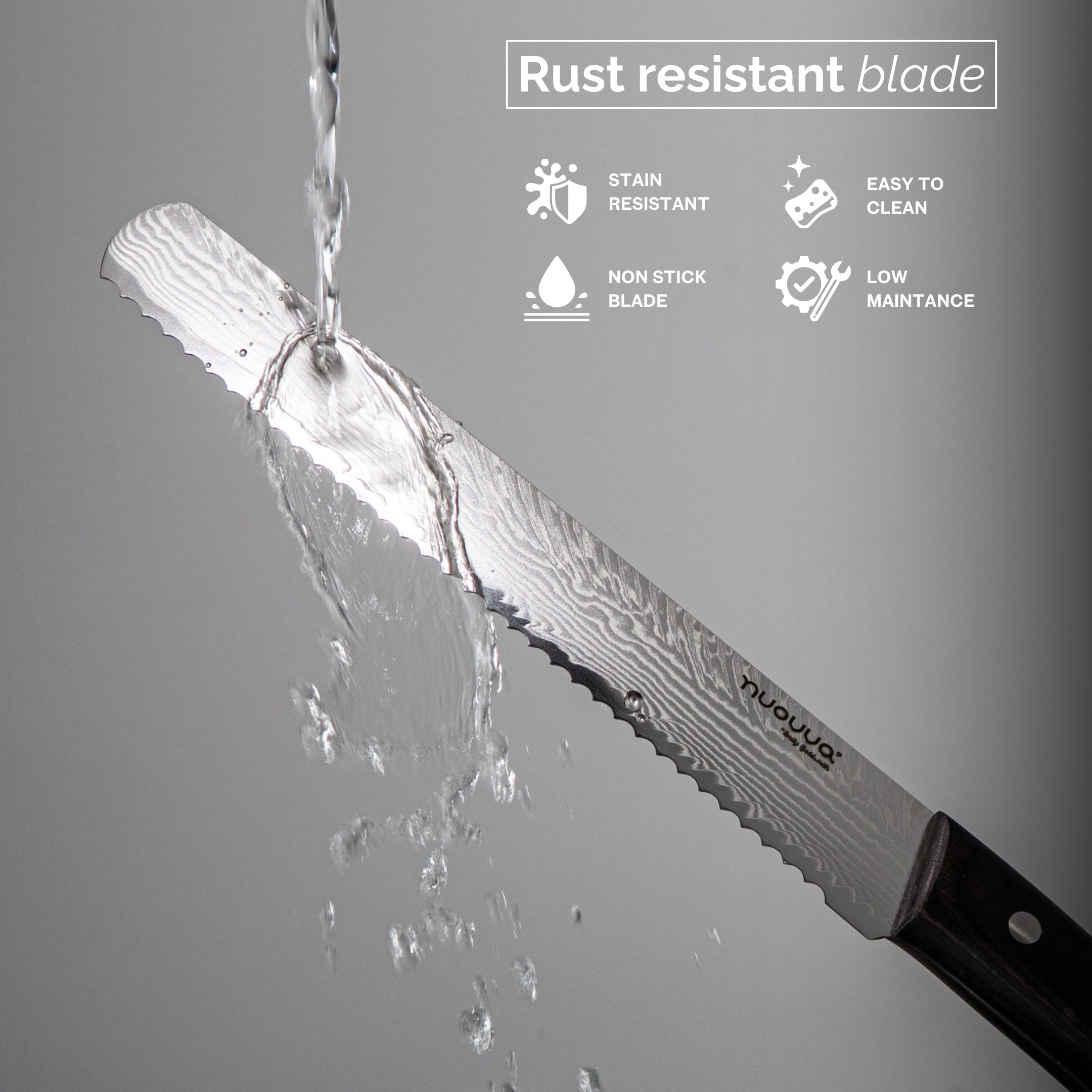 Upgrade your kitchen with the Nuovva 8" Bread Knife. Crafted from 67-layer Damascus steel with a serrated blade and rosewood handle, it delivers precise, effortless slicing and lasting durability.