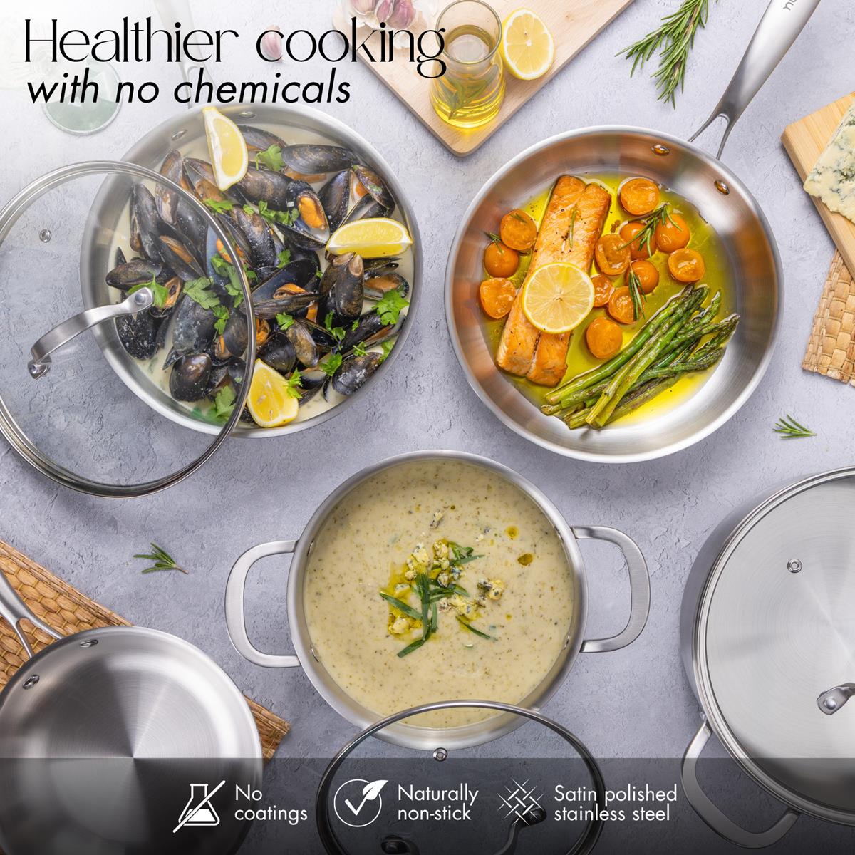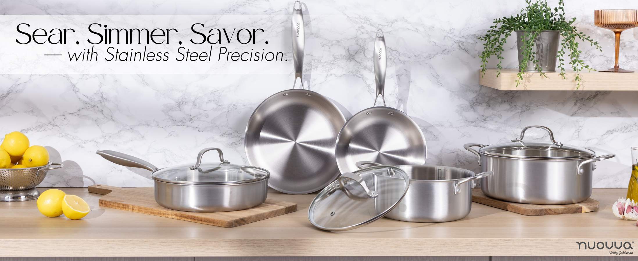 Cook with the Nuovva 8-piece stainless steel cookware set. Includes glass lids, even heat tri-ply design, cool-touch handles, and induction compatibility. Durable and dishwasher safe.