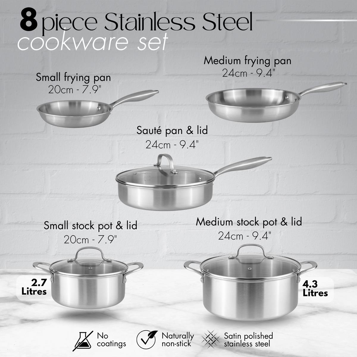 The 8-piece stainless steel cookware set combines performance and practicality. It includes two frying pans, a sauté pan with lid, and two stockpots with lids—ideal for daily cooking tasks. Crafted with tri-ply construction (304 stainless steel, aluminium, and 430), it delivers even heat and lasting durability. Riveted handles stay cool for safe handling, and glass lids seal in moisture. Compatible with all hobs and dishwasher safe, it’s a smart kitchen upgrade.