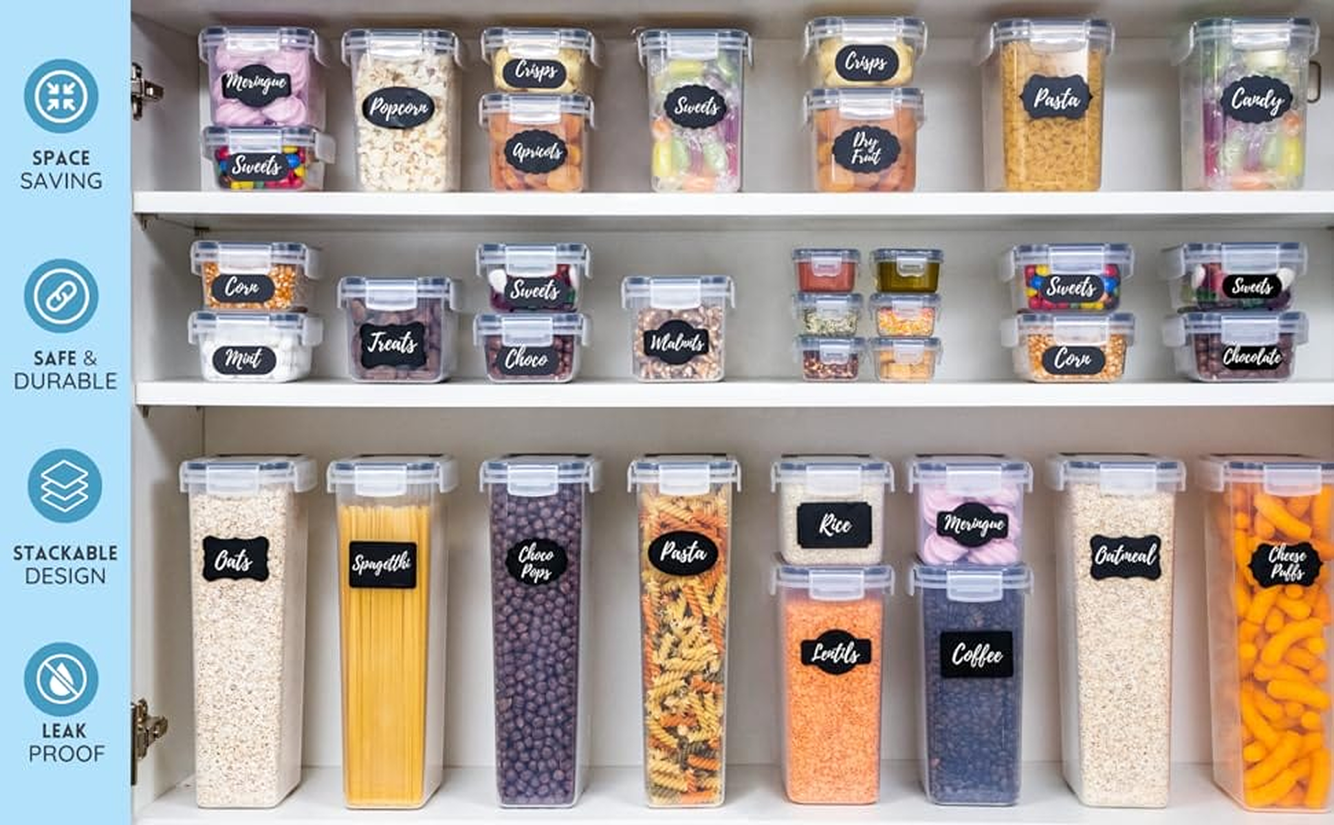 Keep food fresh and organized with this airtight BPA-free container set. Featuring leak-proof lids, clear designs for easy viewing, and chalkboard labels for simple ingredient tracking—perfect for any kitchen.