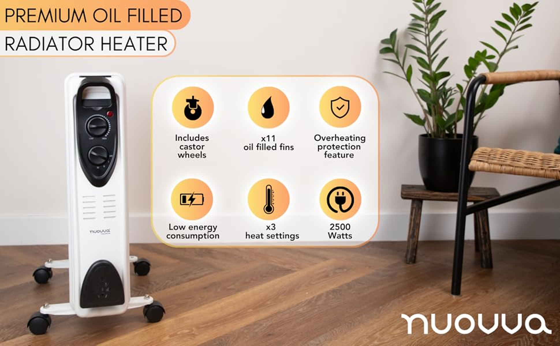 This 2500W oil-filled radiator features 9 fins, 3 heat settings, and an adjustable thermostat.