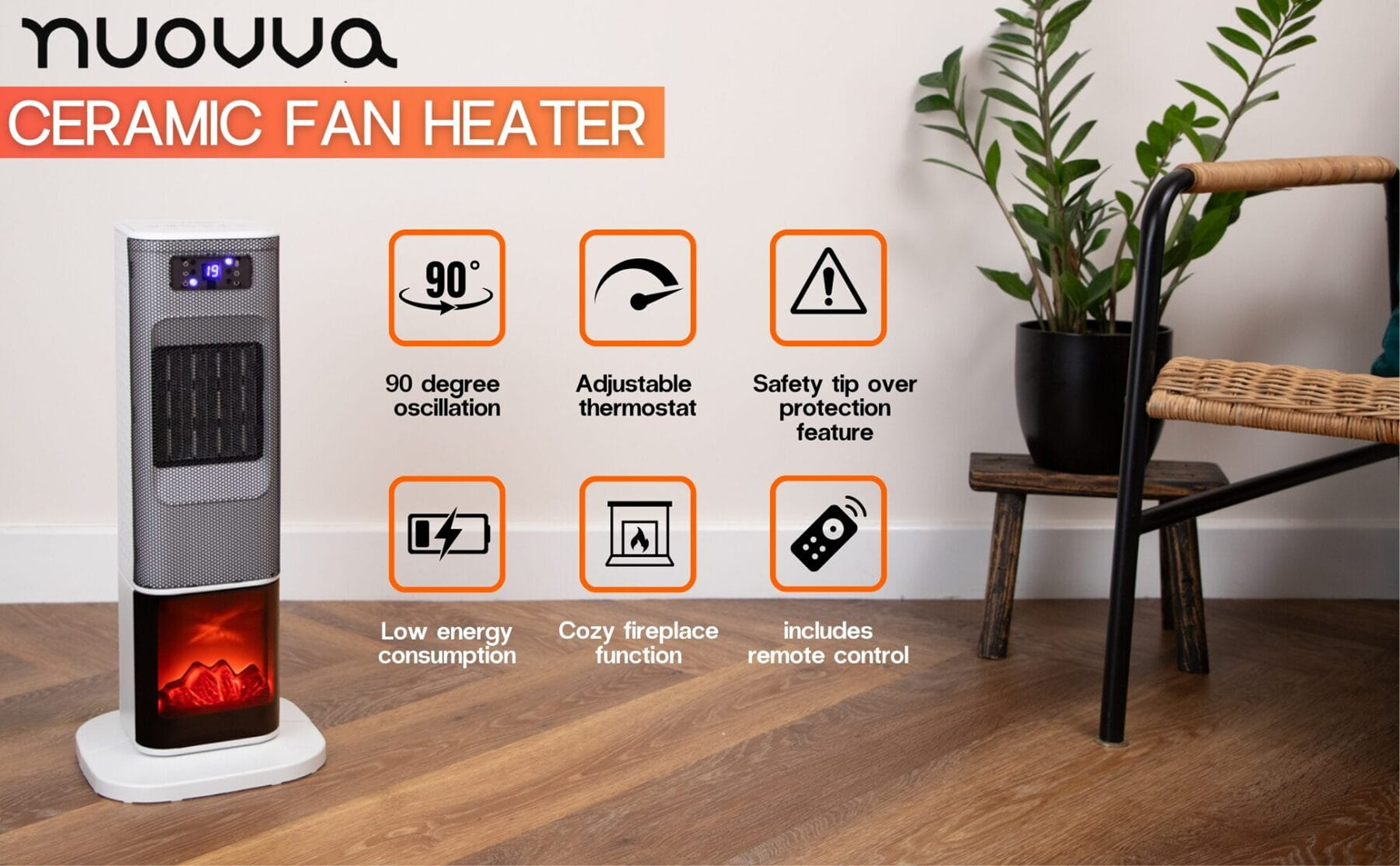This ceramic heater features a fireplace display and oscillating fan for even, efficient warmth.