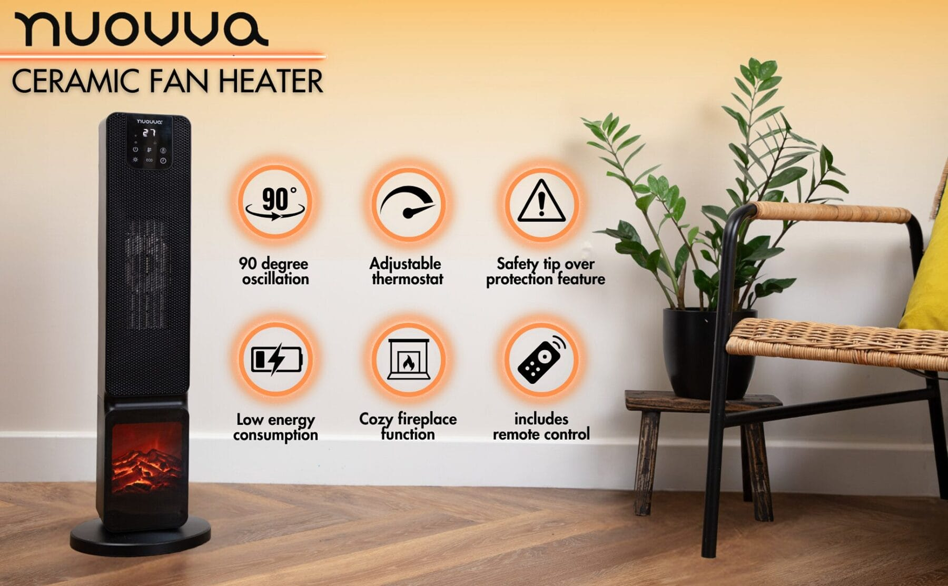 Nuovva electric heater offers fast, energy-efficient warmth with PTC tech, thermostat, timer, and safety features. Includes fireplace display, touchscreen, and remote for easy, stylish comfort.
