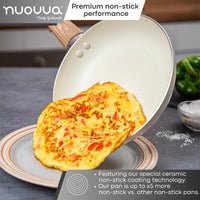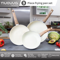 3-piece frying pan set (20, 24, 28cm) with high-quality non-stick coating. Easy to clean, healthy low-oil cooking, even heat distribution, and compatible with all stovetops including induction.