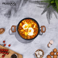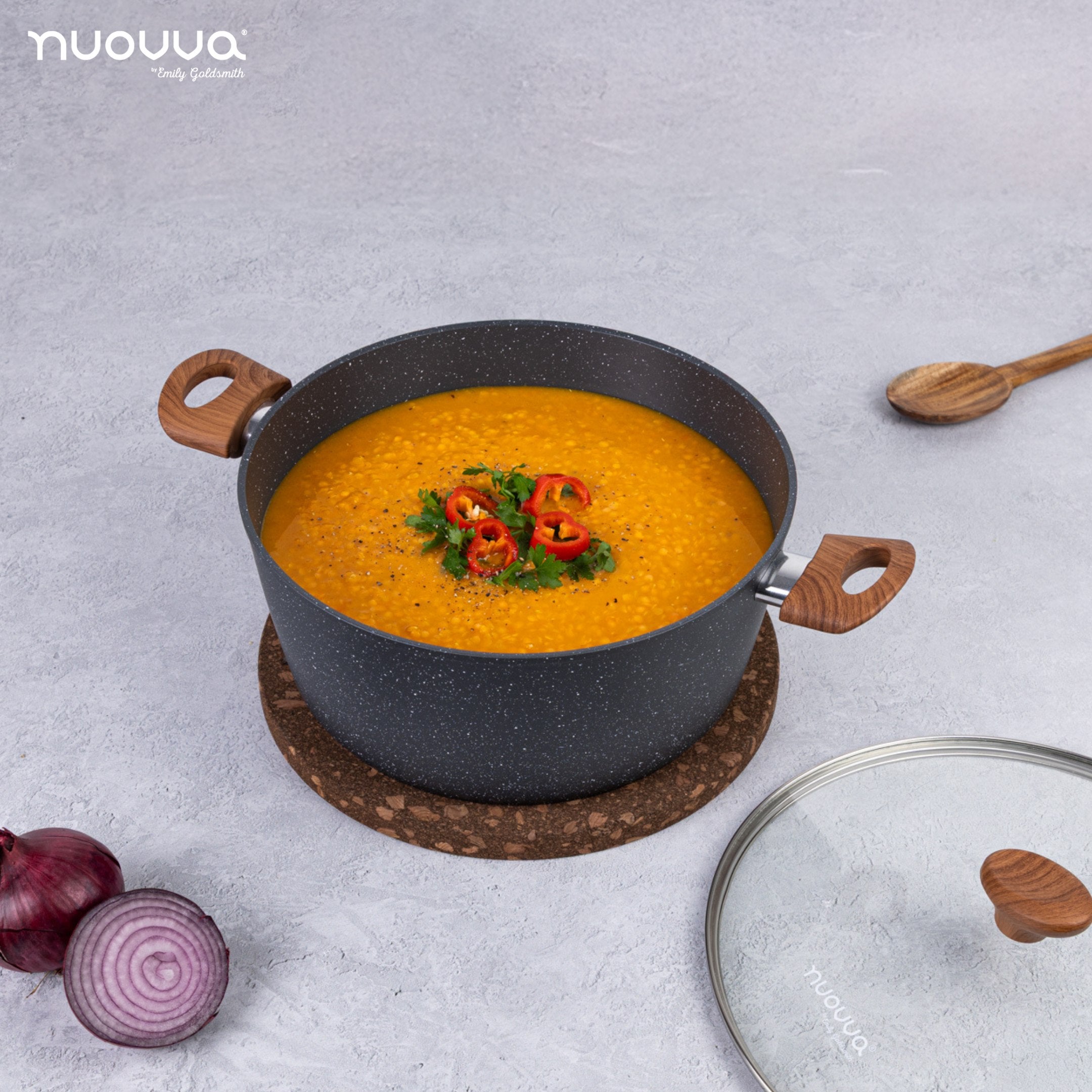 Cook with Nuovva’s 24cm non-stick stockpot—deep design, even heat, and easy cleanup. Stylish grey granite finish with vented glass lid. Perfect for soups, stews, pasta. Compatible with all stovetops.