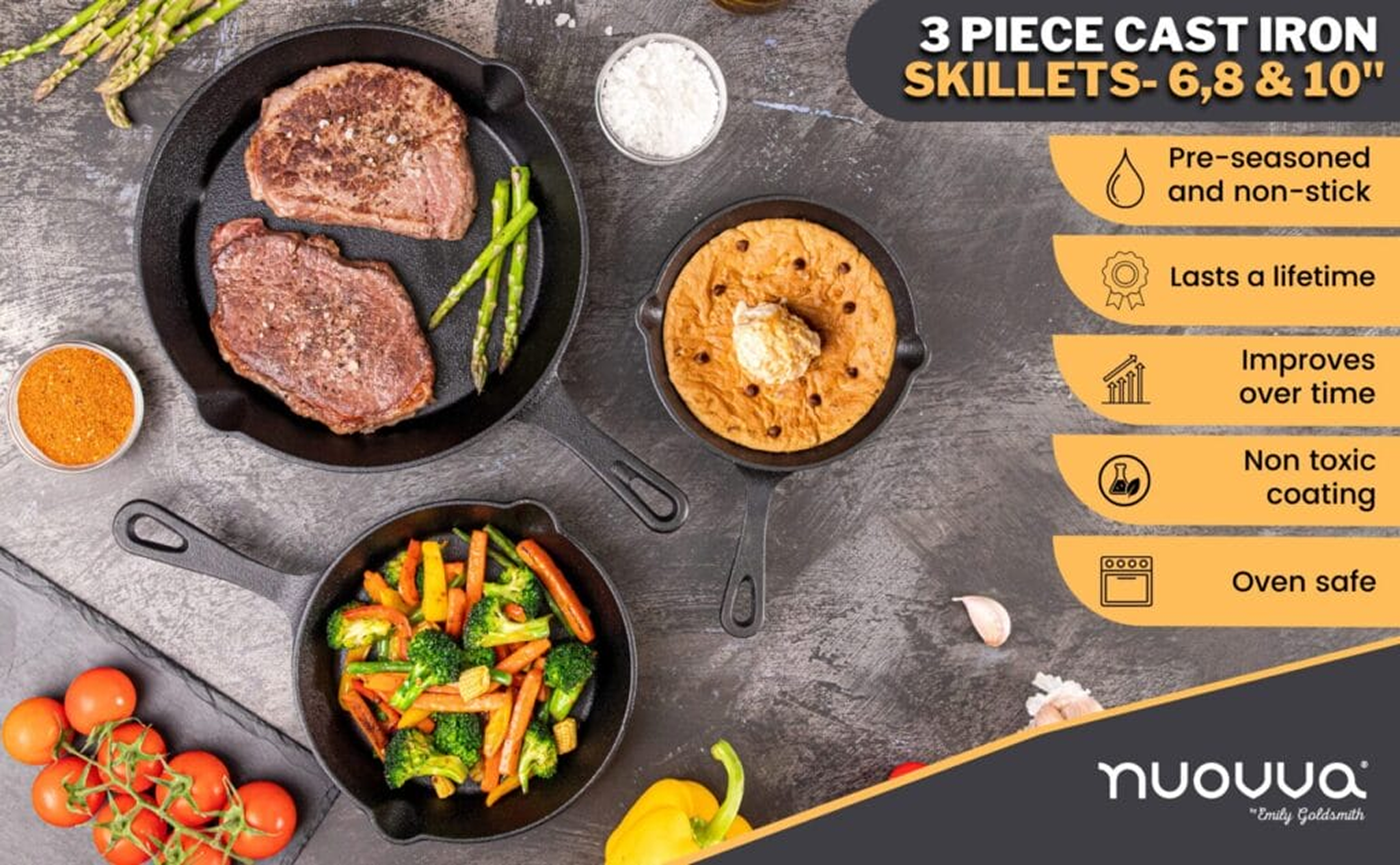 Cook with precision using this pre-seasoned cast iron skillet set (15cm, 20cm, 25cm). Features even heat distribution, natural non-stick surface, and versatile use for searing, frying, grilling, and more.