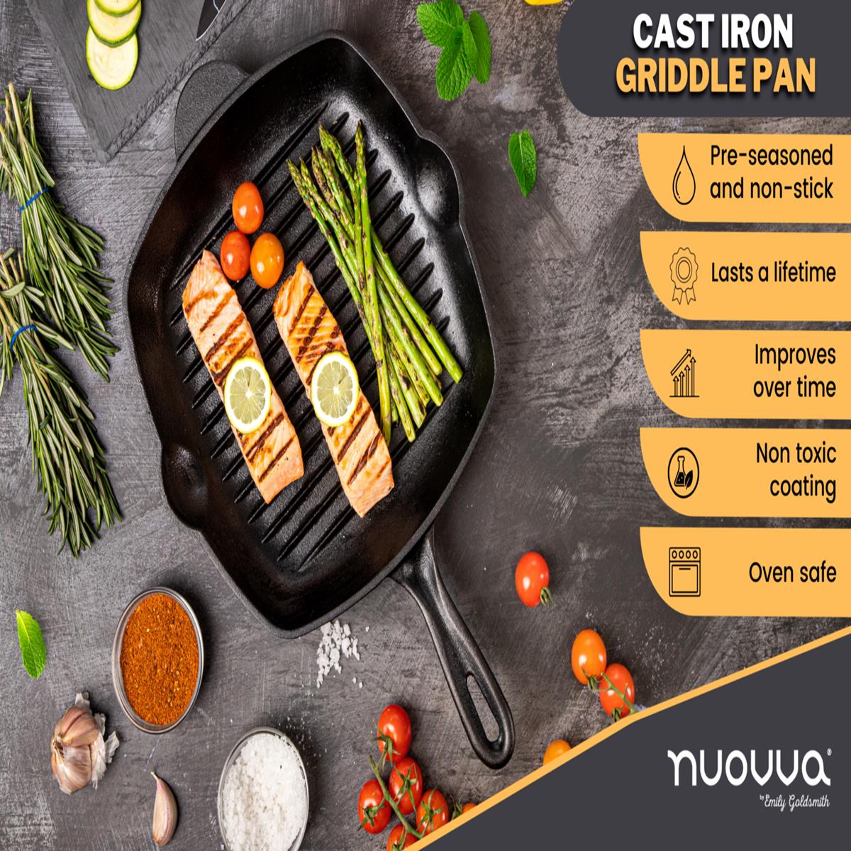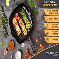 Cook with precision using this 28cm pre-seasoned square cast iron griddle pan. Offers even heat distribution, natural non-stick surface, and versatile use on grills, stoves, and induction cooktops.
