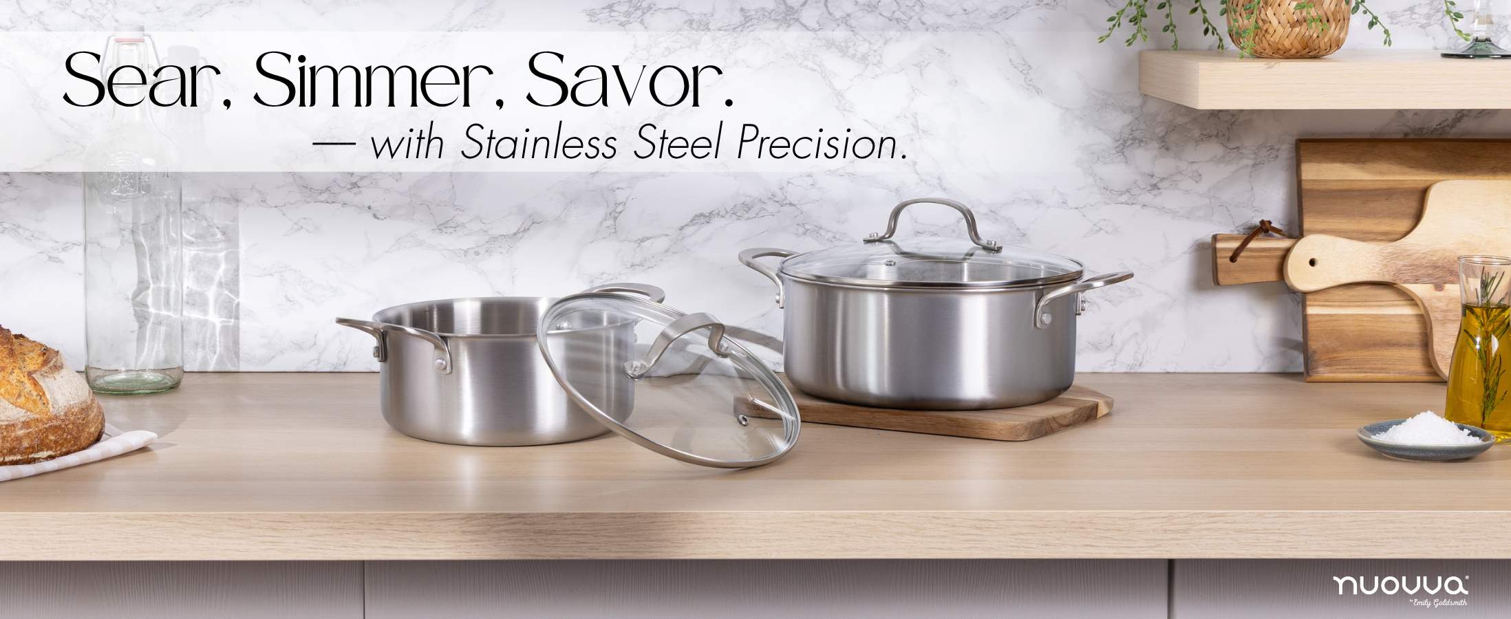 Upgrade your kitchen with the Nuovva 4-piece casserole pot set. Made from durable tri-ply stainless steel with glass lids, cool-touch handles, and compatible with all cooktops. Stylish and dishwasher safe.